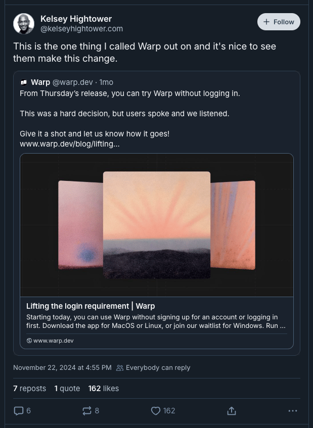 Kelsey Hightower, software engineer and developer advocate, comments on Warp lifting the login requirement