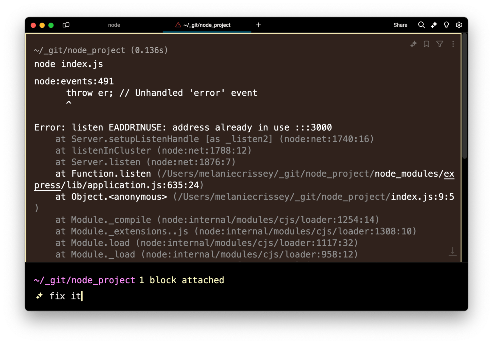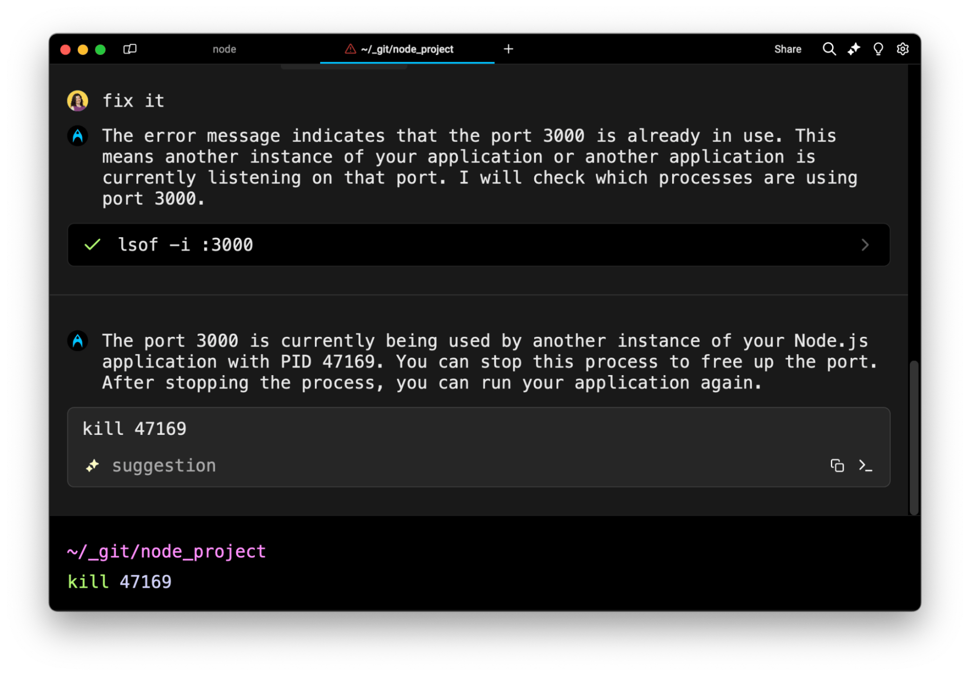 Let’s start with the simplest example: Say you’ve run into the super-common “port 3000 already taken” error. You can type “fix it,” attach the error context, and Agent Mode will respond to help.