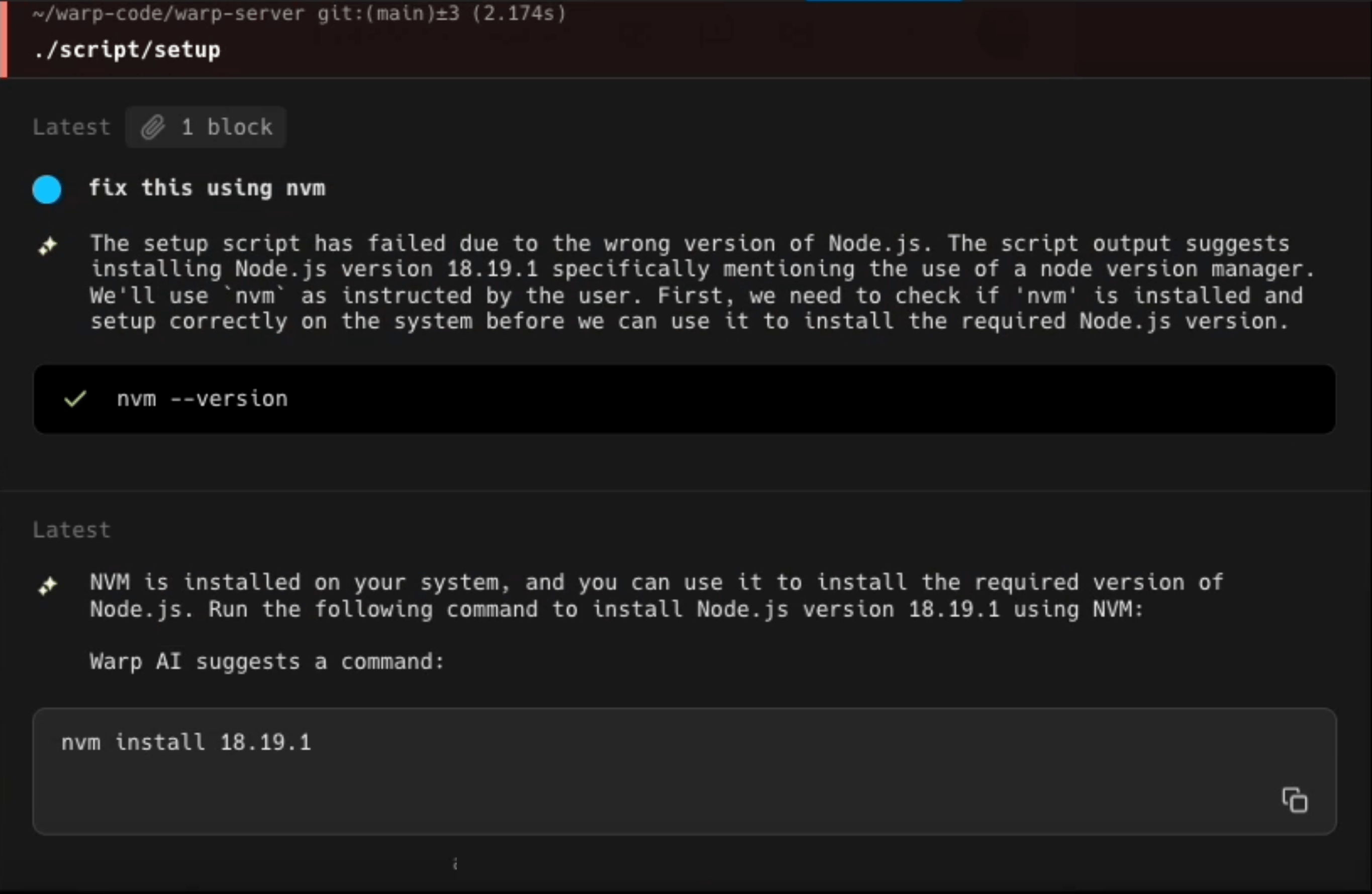 If the AI agent doesn’t have enough context, it will attempt to gather context by running commands on your machine with your approval at every step. For example, when solving an out-of-date node dependency for you, it first asks to run “which nvm” to check which node manager you use. It is only when it knows your node manager that it suggests you install the right node version nvm install 18.19.1.