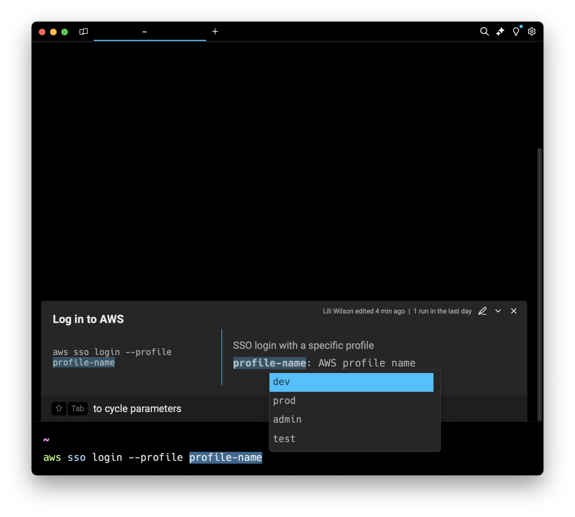Now you can preset a defined list of suggested options for an argument. When you’re ready to run the workflow and build out your command, you can use the arrow keys to navigate through the options list and select the appropriate preset to fill in.