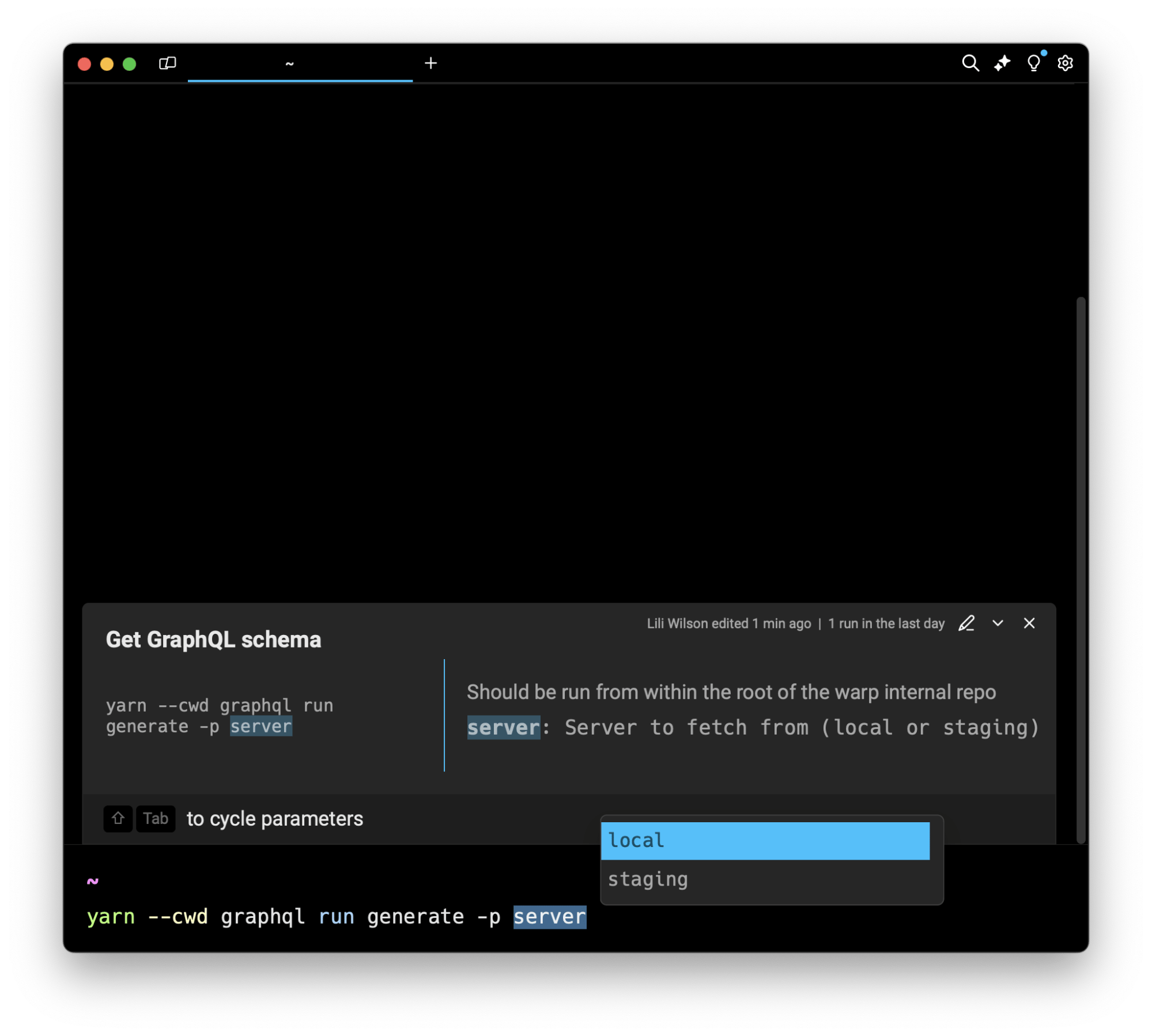 It’s been awesome to bring enum arguments to life over the course of my internship, and I’m super excited to be shipping it. As someone who had to go through the onboarding process onto the Warp team this summer, this is a feature I found myself wanting a lot when encountering new team workflows.