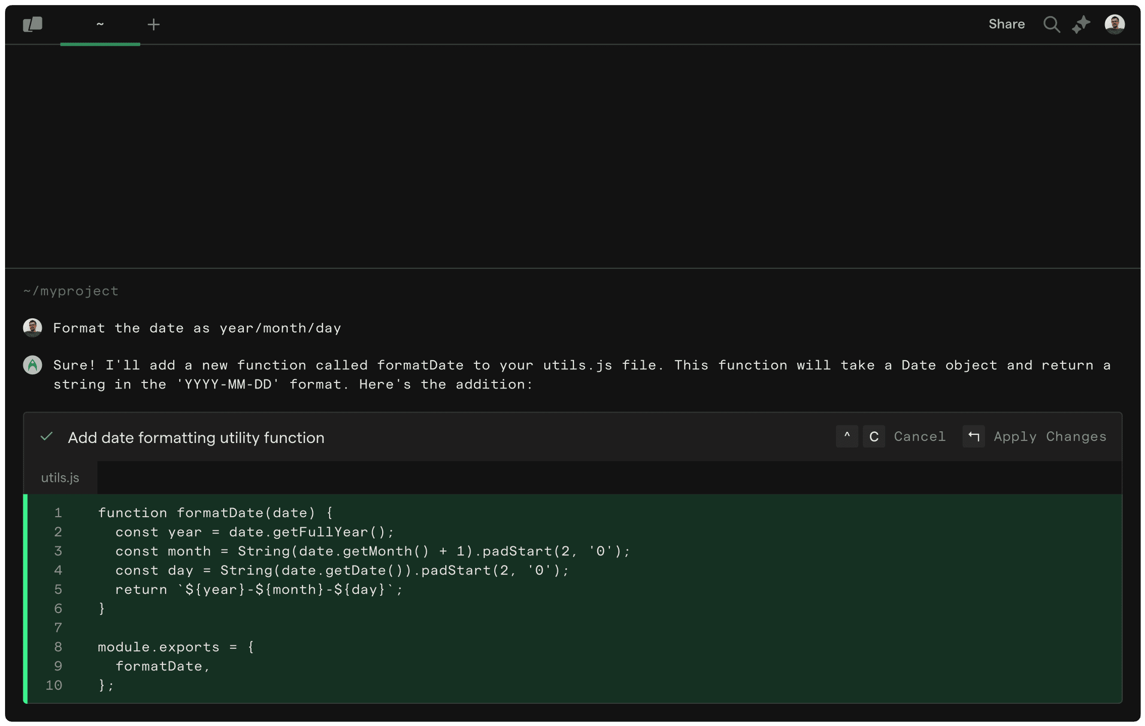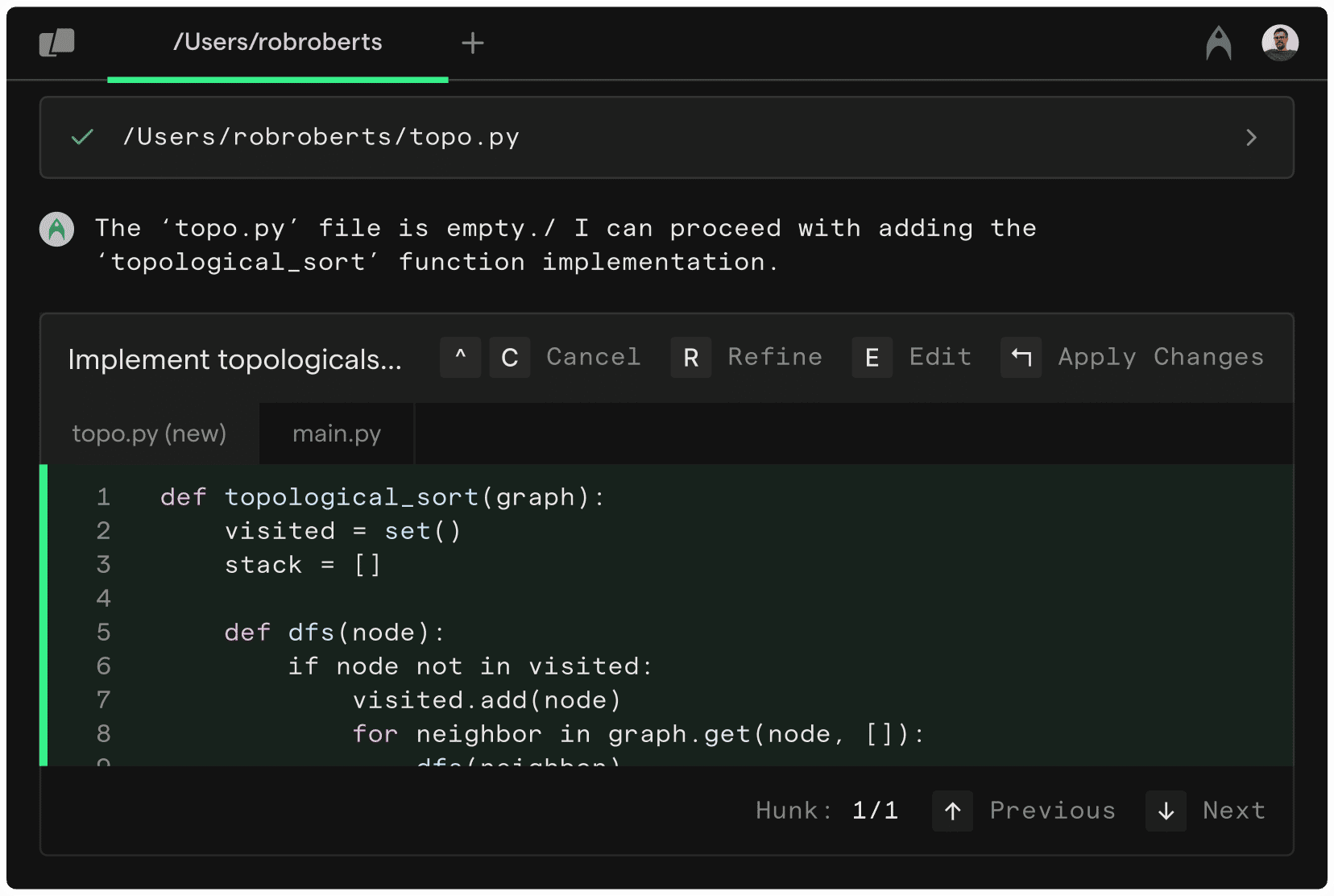 Warp will find the right place to add code, apply a diff and move on to the next step. You can view the changes made, confirm acceptance and make suggestions.