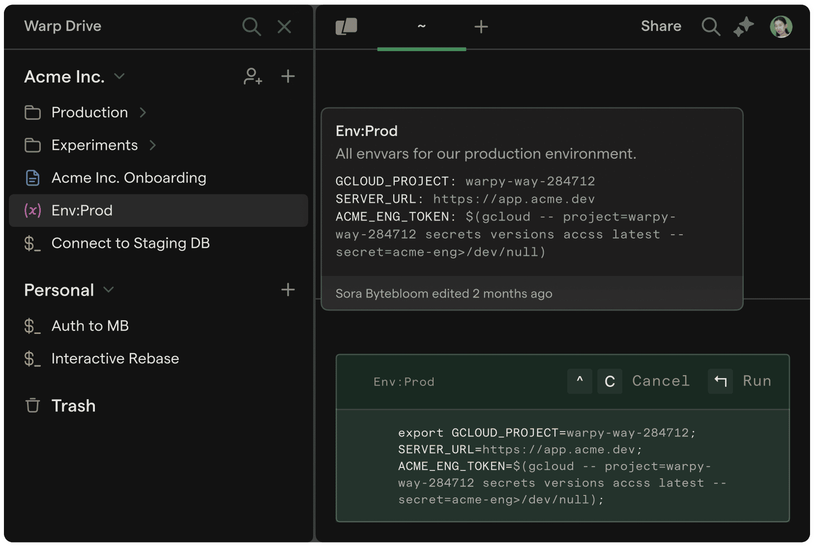 Warp will import packages, manage dependencies and clean up versions - say goodbye to struggling because the wrong version of Python is installed. Environment variables let you store and import API keys and passwords into your sessions securely.