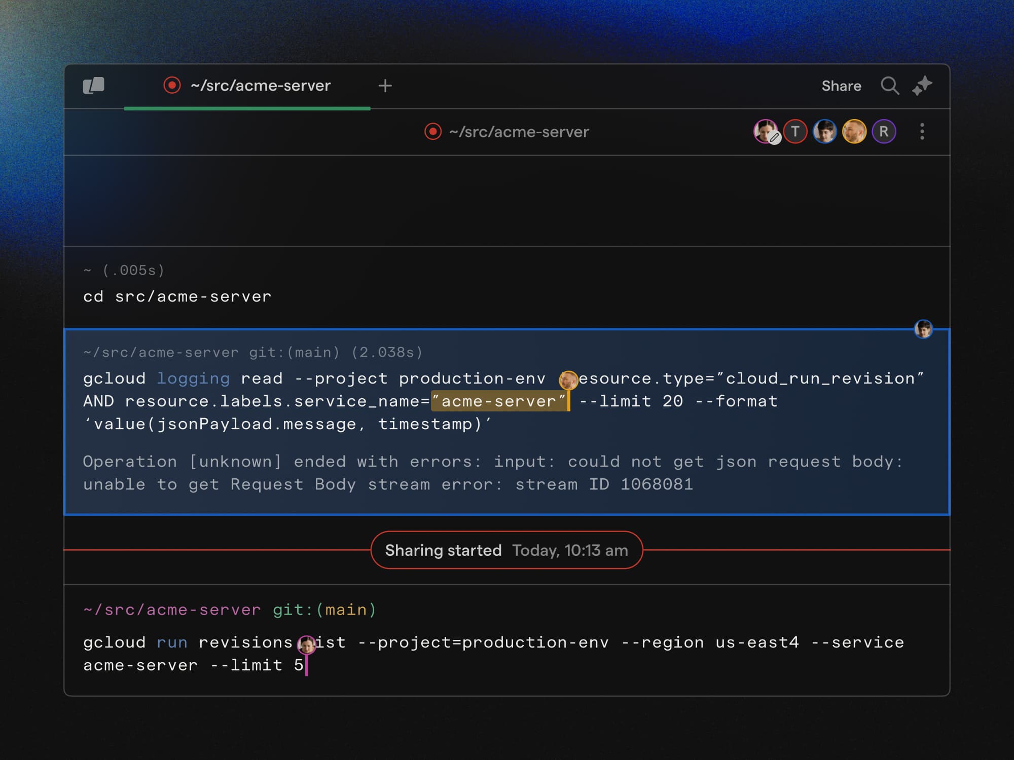 Session Sharing allows you to start working together instantly, with nothing more than a link in a Slack channel. It’s perfect for all of those moments where you need a second (or third, or fourth) pair of eyes on a problem: you’ve hit an error and need to phone a friend; you’re onboarding remotely and having trouble setting up your environment; you’re on-call and need help in your terminal “war room”.