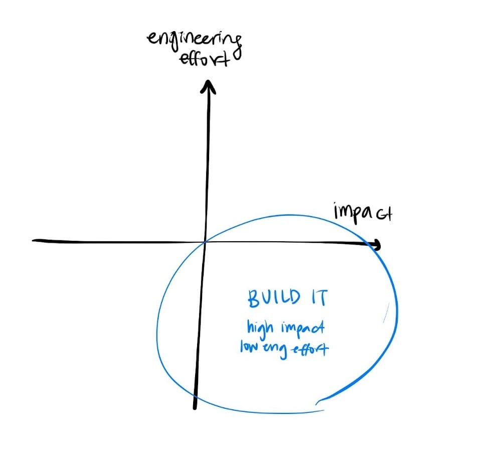 Weighing ideas along the axes of effort (how much work is it?) vs. impact (how much does it help you reach your goals?) is a reasonable framework for evaluating what to prioritize and build. The blue circle marks the sweet spot, when we can have the highest impact with the least amount of engineering effort.
