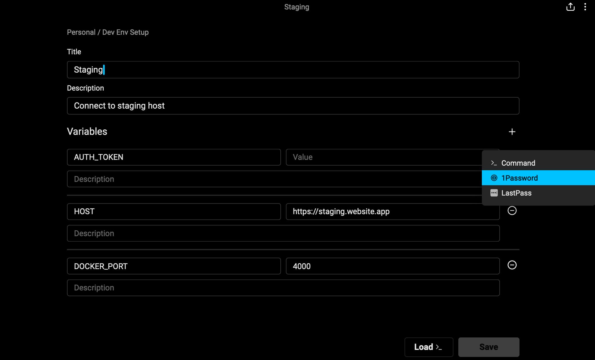 With new dynamic environment variables in Warp, you can load keys or secrets from external managers, like 1Password or LastPass, into your terminal session at runtime.