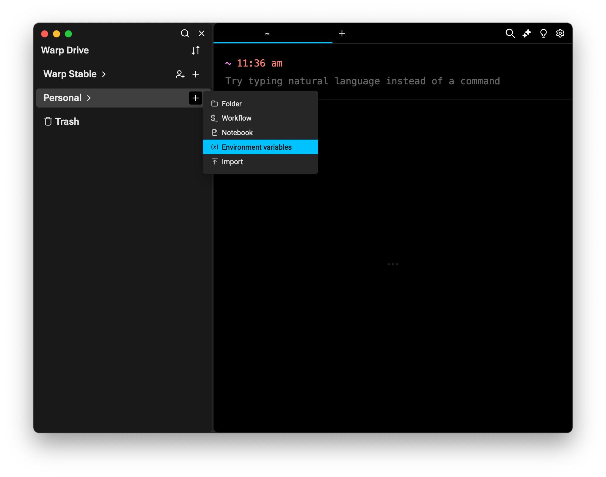 Next, open your Warp Drive and create a new set of environment variables, just like you’d add a new workflow or notebook.