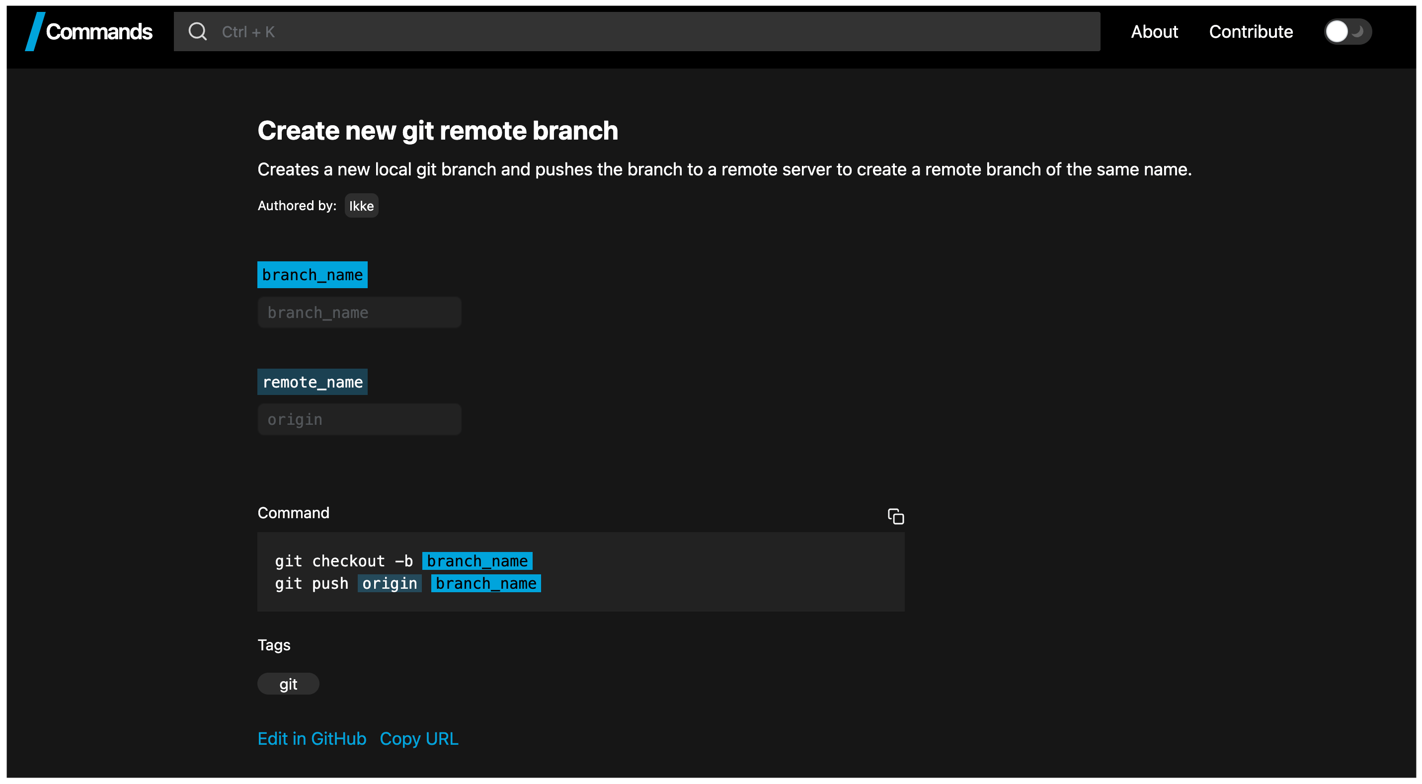 One common use case is creating a new local git branch with git checkout -b, and then pushing it to a remote server to create a remote branch of the same name.