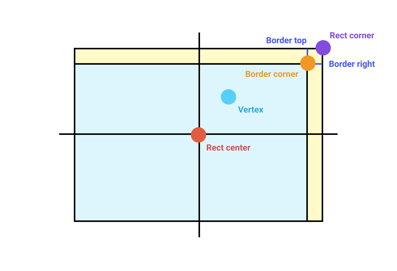 The fragment shader processes a pixel at a time. For each pixel, we have to figure out whether it is inside or outside the border. First, we calculate the border boundary by subtracting the border widths corresponding to the pixel’s quadrant. If the pixel is above and to the right of the center of the rectangle, then we should subtract the rectangle corner by the border top and the border bottom.