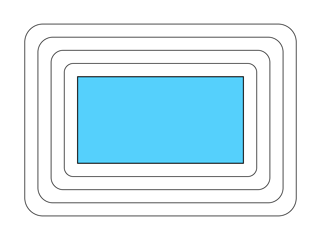 The following diagram draws out four distance fields of a rectangle (lines). Each line represents pixels that are the same distance away from the edge of a rectangle, similar to contour maps in geography. Notice that each distance field matches the outline of rounded rectangles.