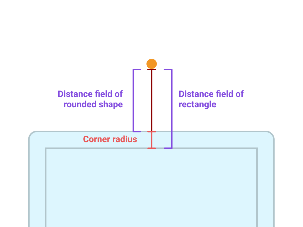 We derive the new rectangle corner of the shrunk rectangle by subtracting the corner radius from the original rectangle corner. We want pixels outside the shape to be transparent, i.e. for the alpha channel of its color to be 0. And pixels inside to be opaque, i.e. alpha=1.