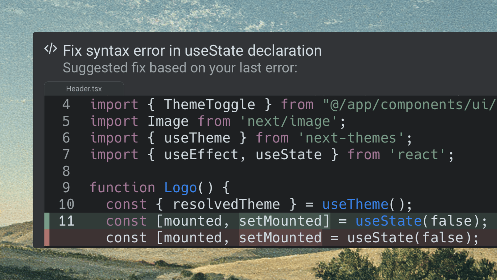 If you have a compiler error or merge conflict, the agent just tries to fix it for you on the spot – you can always dismiss, reprompt, or start a conversation from the suggestion if you need to refine it.