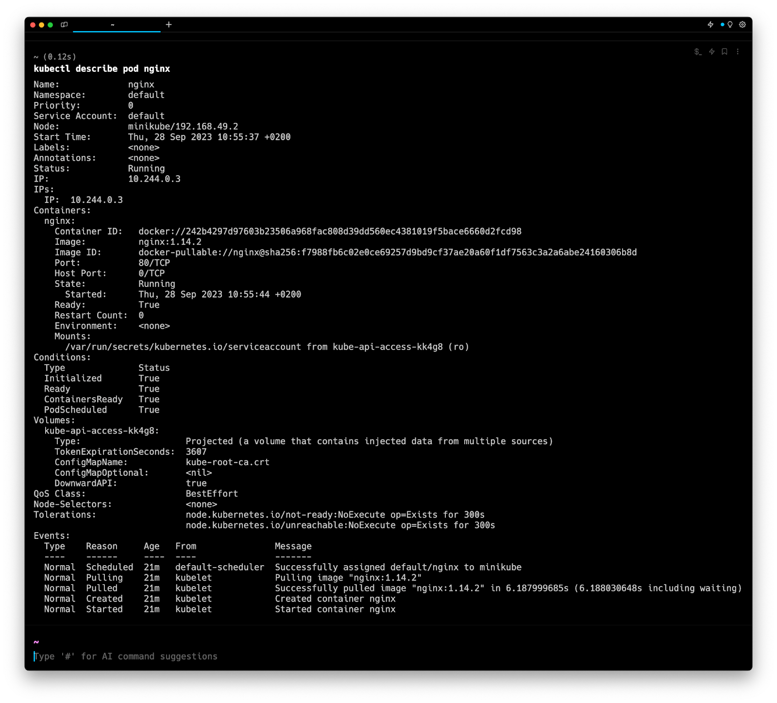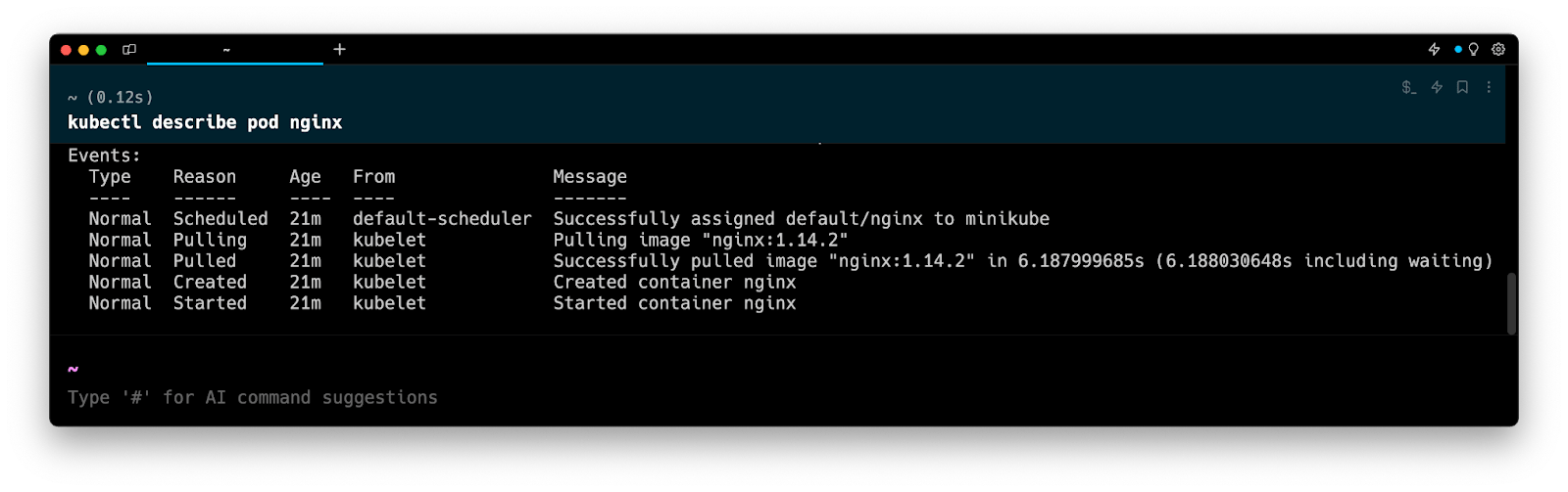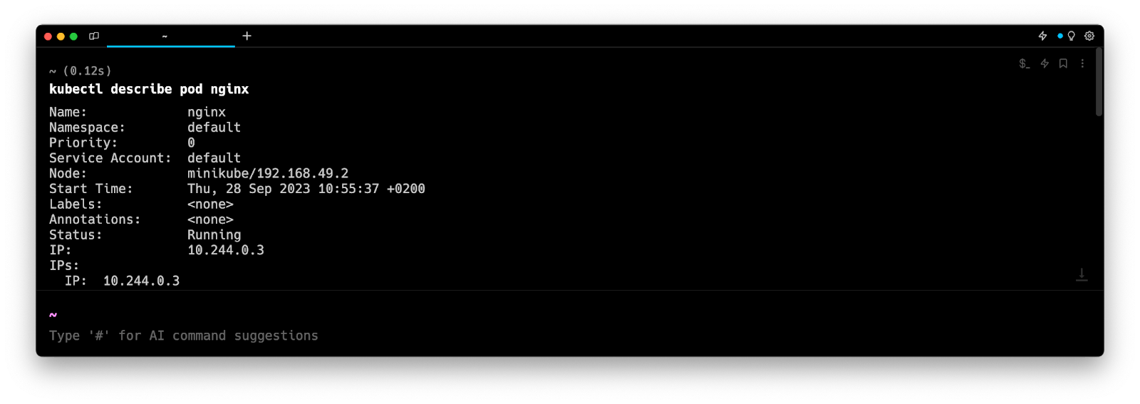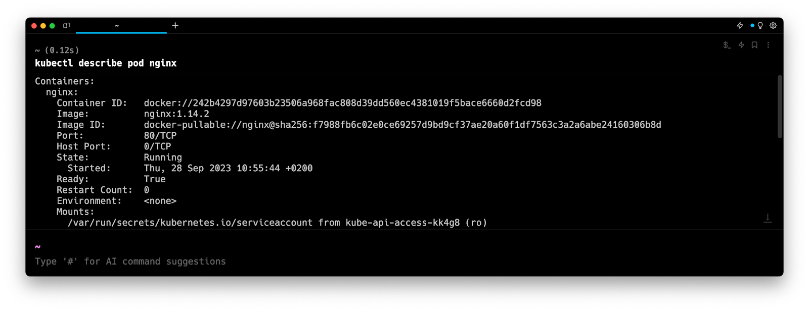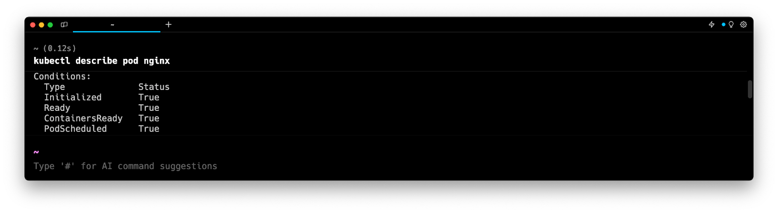 Entering k8 describe pod in the AI Command Suggestions will prompt a kubectl command, which can be inserted quickly into your shell by doing CMD+ENTER.