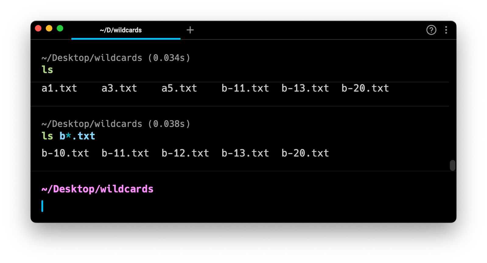 There are also square bracket operators in most shells (notably not Fish). These allow you to define a specific character set to match, e.g. myfile-[0-2].txt. That would match myfile-1.txt and myfile-2.txt, but not myfile-3.txt or myfile-10.txt. Square bracket operators can give you more granular matching than * or ?. Note that a square bracket expression can only match a single character; unlike regular expressions, there's no repeat operator. Square brackets can contain a list of individual characters that are matched, e.g. [adg] to match a, d, or g, or a range of numbers or letters to allow, specified with a hyphen between two characters. Matching is case-sensitive, so if you want to match any letter between a and z regardless of case, your expression would be [a-zA-Z]. To replicate the * operator but exclude any non-alphanumeric characters, use [a-zA-Z0-9].