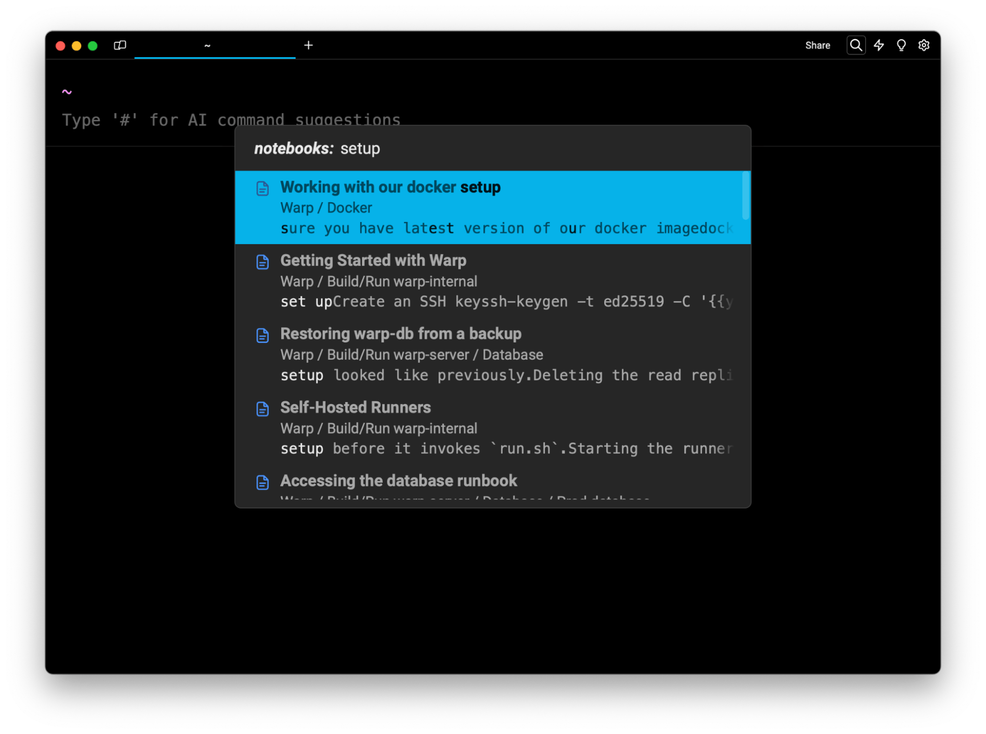 With new Notebooks in Warp Drive, your terminal-specific documentation stays in your terminal.