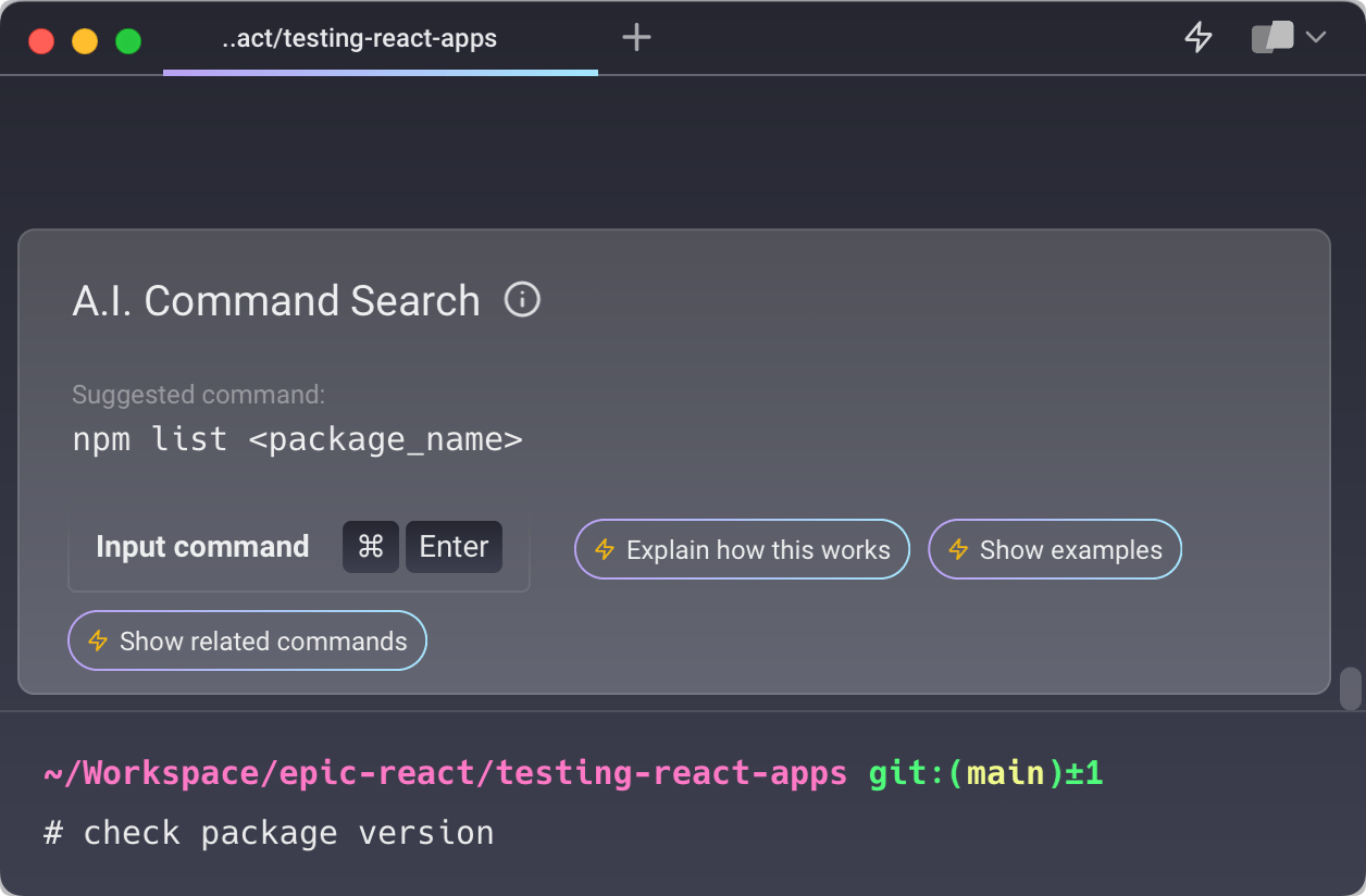 Typing # and entering check package version in the AI Command Search will prompt a npm list command that can then quickly be inserted into your shell by doing CMD+ENTER.