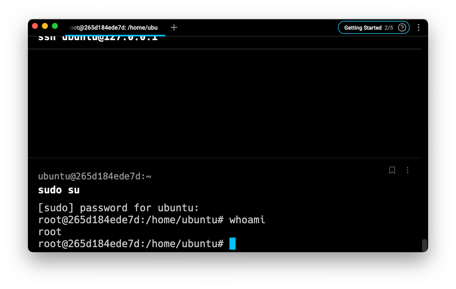 Once you’ve entered your password, you can confirm that you are logged in as the root user by using the whoami command that prints the effective user name of the current session.