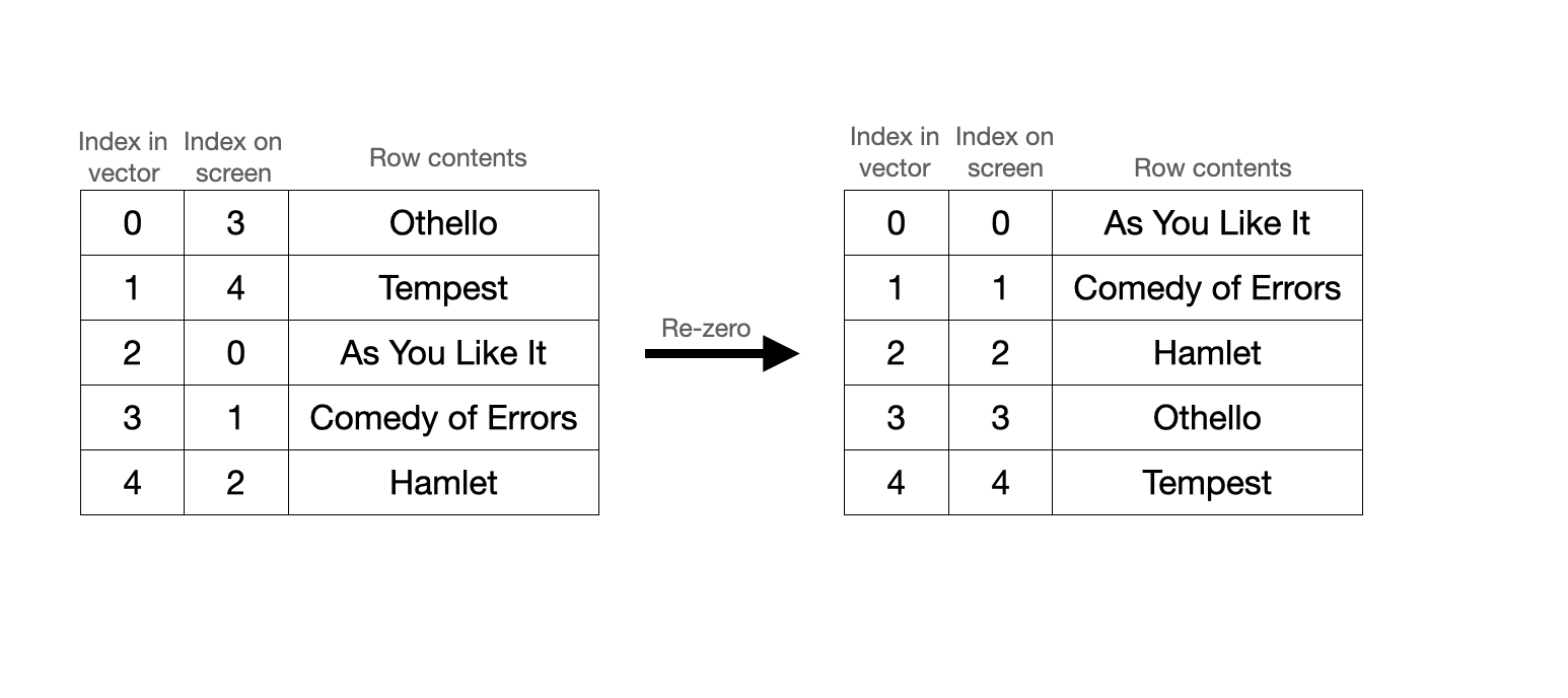 Nevertheless, the whole process of index conversions presupposes that the grid needs to be rotated in the first place. Why is that the case? Why not skip the silly conversions and enforce equivalence between the screen indices and the vector indices, meaning that “As You Like It,” the first row on screen, is also stored as the first row in the vector? Not surprisingly, this is because the grid is heavily optimizing for something else entirely: scrolling!