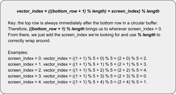 4 Question: this seems to be using bottom_row just to compute the “top row” (where screen index = 0) and it does that for every conversion. Why not just store the “top row” index instead of the bottom? Answer: It’s a really good question. The reality is that converting between “bottom row” and “top row” is some fixed cost of a couple arithmetic operations and, while it’s probably meaningless in most cases, it’s ever-so-slightly preferably to pay this penalty at the time of rendering the grid than at the time of writing the contents of the grid, where it’s a neat optimization to quickly know where the next line of output goes.