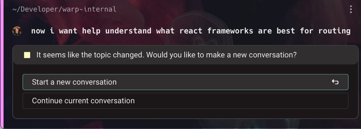 Warp includes a feature which will attempt to detect when a conversation has switched subjects sufficiently such that it’s best to start a new conversation, instead of continuing the previous one. However, you know best as to when the previous conversation is no longer relevant to your current ask!