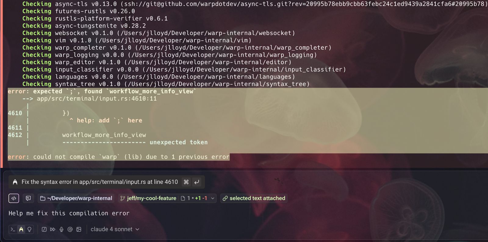Warp makes it easy to select one or many blocks and add them to AI queries. For example, you may have a crazy Rust project that prints out thousands of lines of output when building, only for the last 5 lines of output to show a missing semicolon on one line of one file. If this happens, consider selecting the relevant text in the output and asking your query with “selected text attached” rather than attaching the entire block. This will reduce the number of credits, and has the additional benefit of keeping the agent more focused on the relevant parts of the issue!