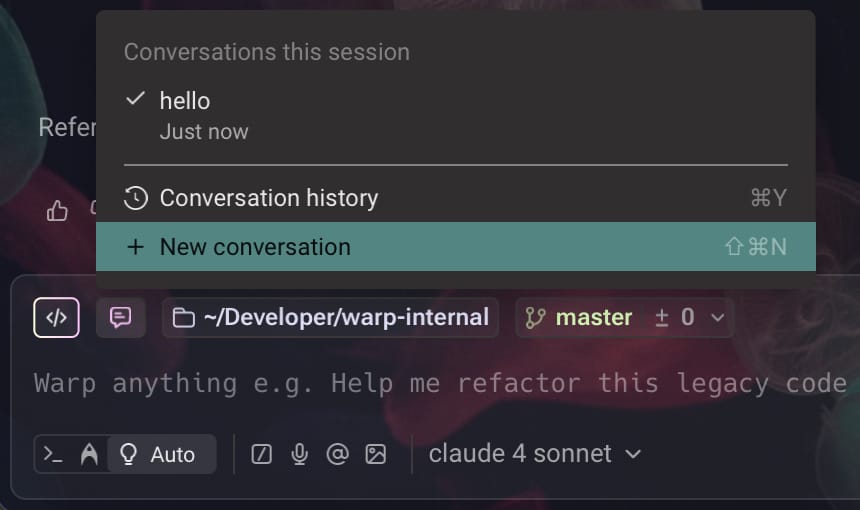 Let’s say you just asked Warp to build a new feature in your React app for you. It completes the task and summarizes what it did. When you go to deploy it, you realize that your gcloud binary is corrupted, and you want help fixing that too. If you follow up on the summary from the React conversation, not only might you confuse the agent by talking about a totally different task than the one it built up a lot of context trying to understand, but by continuing an irrelevant conversation, you’ll use a lot more credits, too! Instead, use the conversation selector in the input to start a new conversation, or open up a new pane or tab.