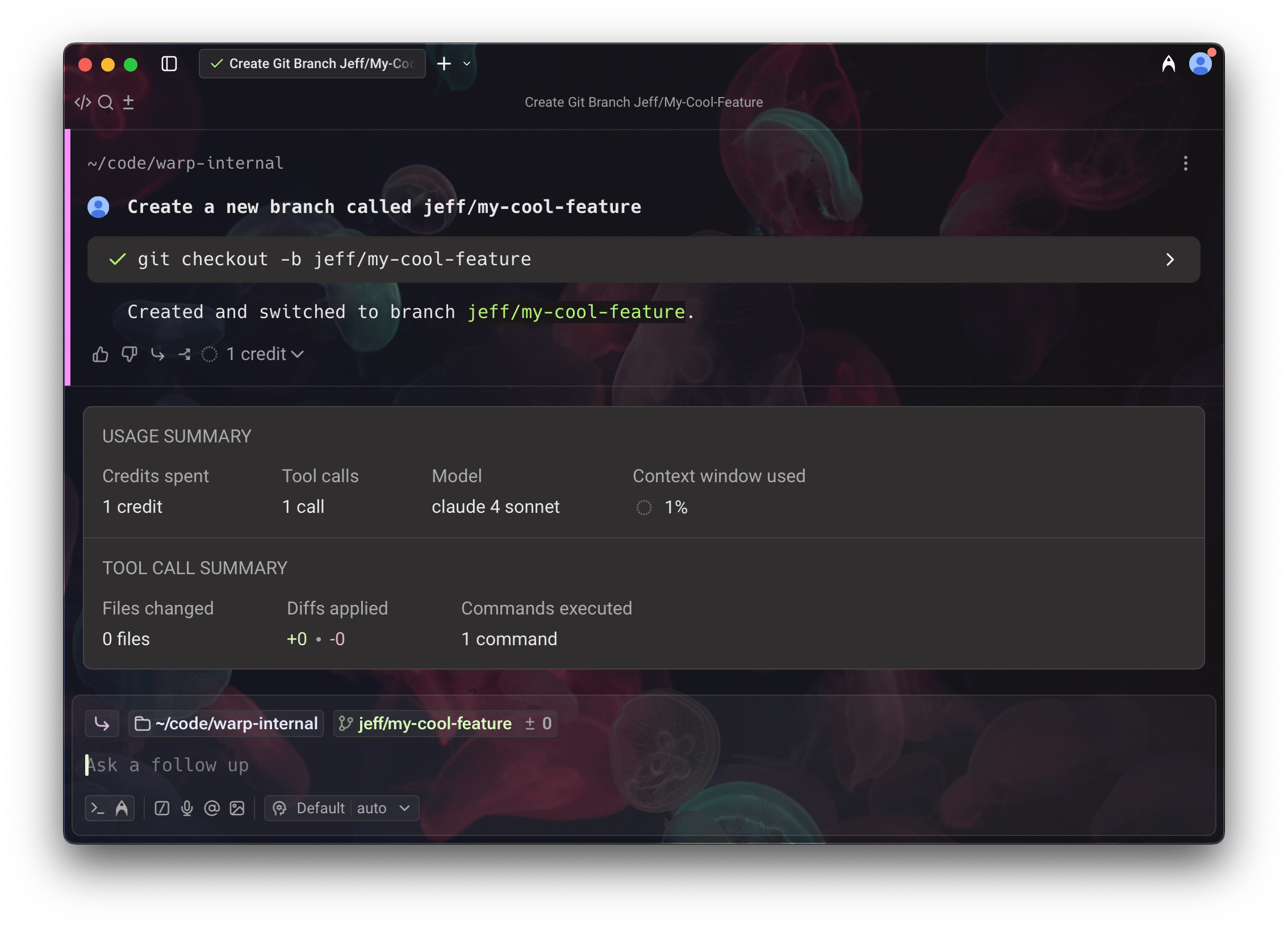 Each time you use Warp’s AI features, credits are consumed based on the interaction. At least one credit is used per request to an AI agent. For example, a simple prompt like “Create a new branch called jeff/my-cool-feature” might use one credit. In fact, in my testing, it totally does! You can check the number of credits used since your last user input to the agent via the informational tooltip at the end of the conversation.