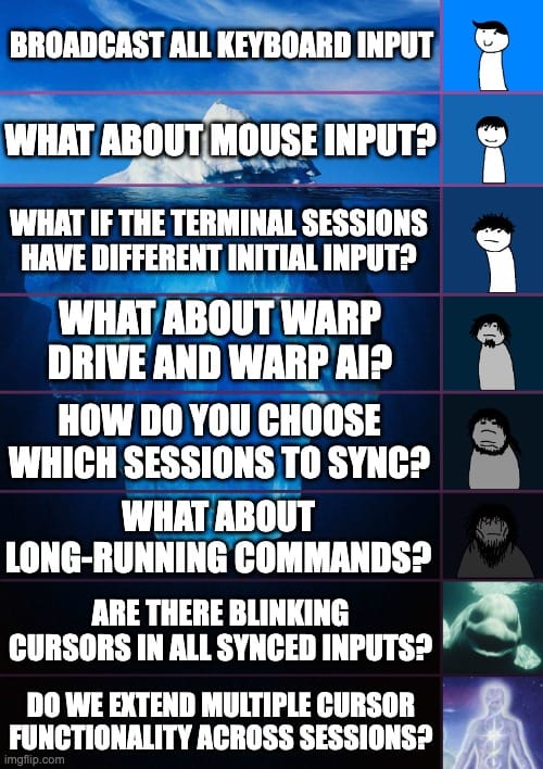 It all started with this GitHub issue feature request. Users coming from other terminals like iTerm2 wanted the same broadcast input functionality. Broadcast input is a mode that lets you type input in one terminal session and have that input sent to other terminal sessions at the same time. An example use case is running the same setup scripts on multiple servers you’ve SSHed into. Sounds pretty simple, right? We’ll see.