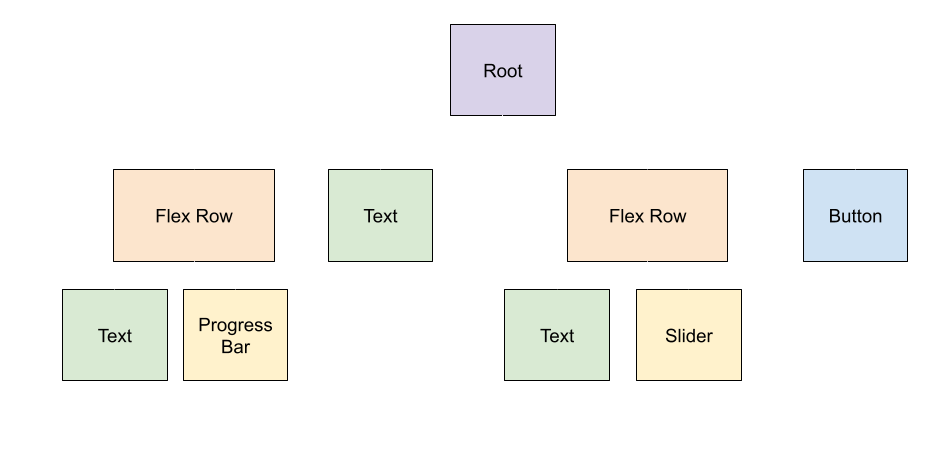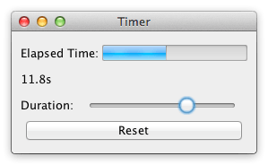Let’s use a timer, one of the tasks from 7GUIs, as an example of how this tree structure would be useful. Our timer will have a progress bar to show the elapsed time, a slider to adjust the duration, and a button to reset the timer.