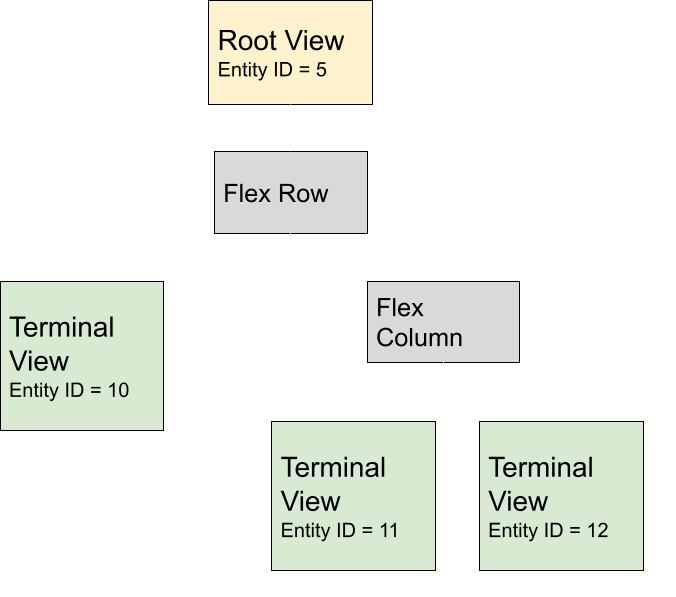 The use of these EntityIds allow us to encode a component tree structure without inheritance. The actual view tree for the screenshot above would look something like: