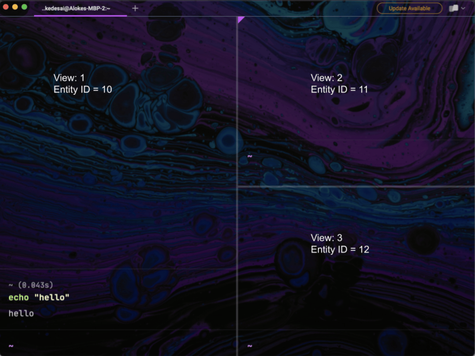 In an object oriented world, all of the state for each of these components would be encoded within the component. In ECS, this data is denormalized into a series of maps and lists owned by the system. We use this EntityID as the key across any structure that holds state for a view. In this screenshot below of Warp we have three different views, each of which have unique EntityIDs: