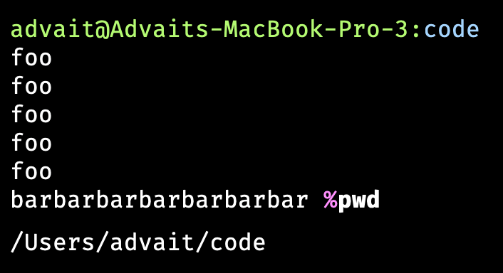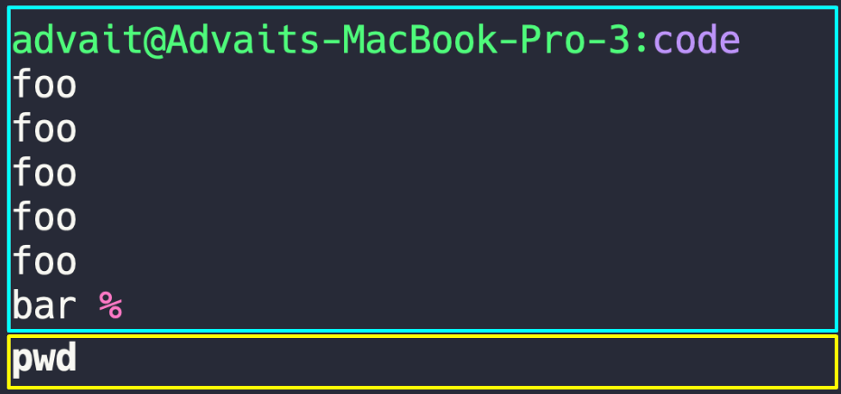 You can imagine that we can no longer have two rectangles neatly stacked on top of each other, since the last line of the prompt and the first line of the command should now exist on the same row. To solve this issue, we split the prompt into two separate grids. In this case, the first prompt grid would cover the first five “foo”s, and the second prompt grid would cover the “bar %.” This allows us to put the input editor component inline beside the prompt.