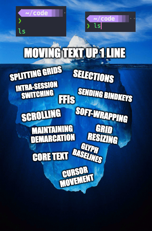 You may notice that even though we’ve separated out the prompt into two grids, the last line of our prompt still overlaps with the input editor component. In our code, we are having the input editor component now include this truncated prompt grid as part of the component, in what we’re calling the “left notch.” Notably, introducing this left notch into the input editor component leads to a lot of downstream effects in scrolling, text selection, and soft wrapping that we’ll talk about next.
