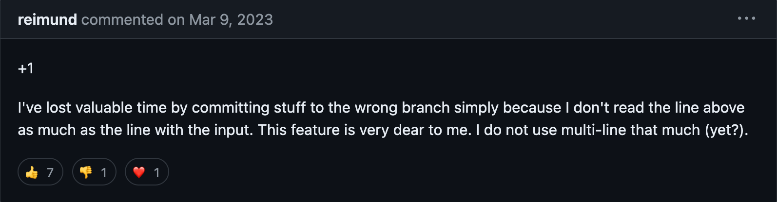 Others explained that the multiline experience took up too much vertical space in their terminal, or that a blinking cursor on a new line signaled that a long-running command was running.