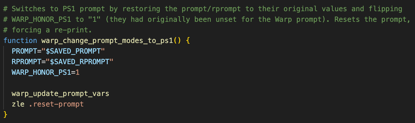 In the custom shell prompt (PS1) case, we want the shell to output characters directly and manage the cursor as it would in a normal terminal, i.e. it should move over for each character of the lprompt, and then to the characters of the command. However, in the Warp prompt case, we want to NOT move the cursor over, since the command should start at row/column (0, 0). Thus, it’s important for Warp to tell the shell whether we’re using the PS1 prompt (where we have “normal” cursor movement) or the Warp prompt (where the shell prompt is essentially “empty” i.e. should not affect cursor movement).