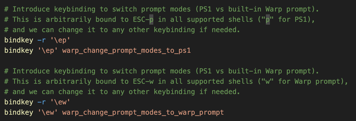 We give the shell this information by using environment variables and indicate changes with bindkeys. These are essentially keyboard shortcuts that we define in code that trigger shell functions. In the code below, we’ve defined ESC-P and ESC-W as bindkeys. When ESC-P is triggered, we know to respect the shell prompt to account for the left notch, and the opposite behavior when ESC-W is triggered. The underlying custom shell functions will update the environment variables appropriately and redraw the prompt (to display the correct prompt intra-session, without needing to open a new Warp tab).