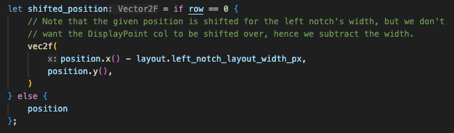 In this example, we have two different coordinate spaces to consider. The first is the window coordinate space, where the highlighted “S" would have absolute X and Y pixel coordinates. The second is the Input Editor coordinate space, where the highlighted “S” would be at row 0, column 0. Previously, the translation between the two coordinate spaces was easier, but with the existence of this left notch you can imagine that row 0, column 0 of the first line is actually now offset by some amount of characters.